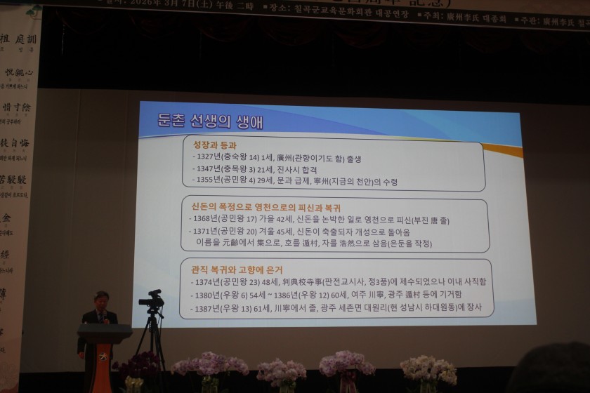 2026년 3월 7일 칠곡군 교육문화회관 대공연장에서 실시한 둔촌선생 탄신 700주년 기념 학술대회를 개최하였습니다.