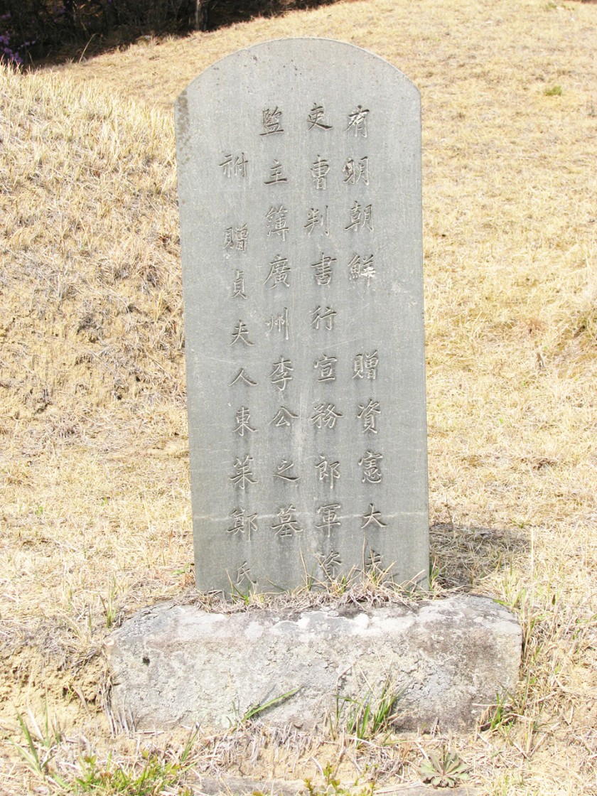 墓所는 枝川面 昌平里 山 41番地 寅坐(경북 칠곡군 지천면 창평리 산 41번지) 配. 贈 貞夫人 東萊鄭氏 癸亥 6月 26日 卒 雙墳